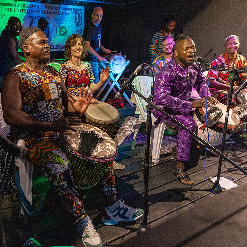 Djemboree is a yearly event, where djembe and dundun drummers with some experience gather to learn, play together and celebrate. It features daytime drumming workshops, plus end of day group performances (one day with each teacher), plus the ‘Saturday Night Spectacular’, at a nearby venue.